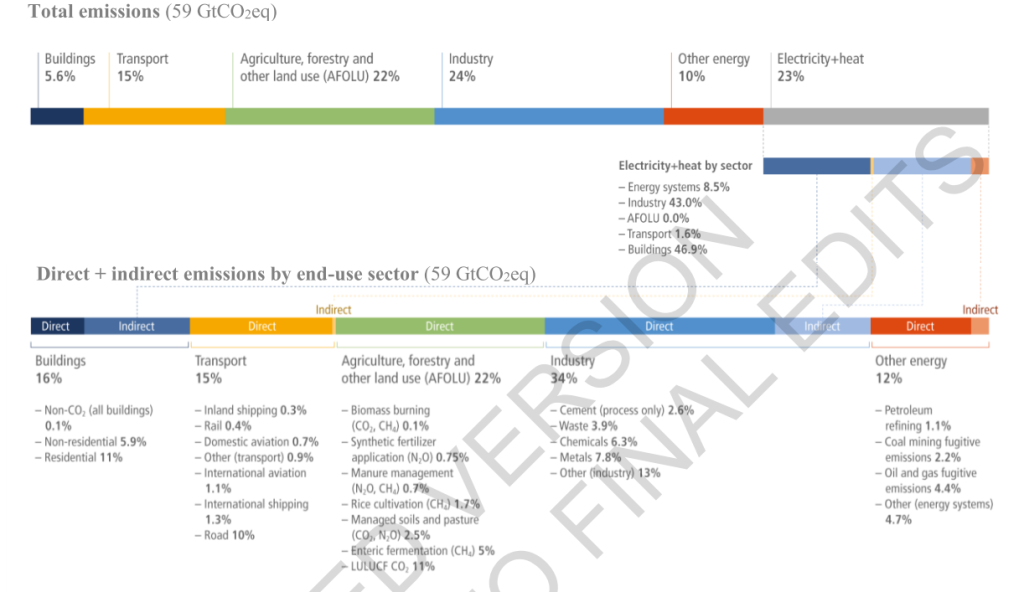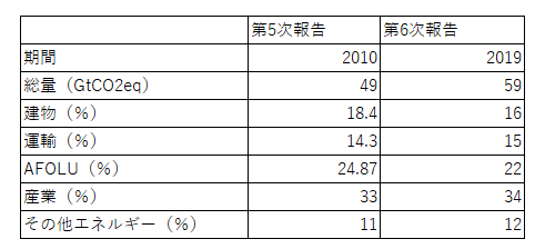 これについての記述が SPM B2.1 です。「2019 年における、正味の人為的 GHG 排出量の約 34 % [20 GtCO2-eq]がエネルギー供給部門からで、24 %[14 GtCO2-eq]が産業部門から、22 % [13 GtCO2-eq]が農林業及びその他の土地利用(AFOLU)から、15 % [8.7 GtCO2-eq]が輸送部門から、6 %[3.3 GtCO2-eq]が建築部門からもたらされた。 電気や熱の生産に伴う排出を、最終的にエネルギーを利用する部門に帰属させると、これらの間接排出の 90 % が産業部門と建築部門に割り当てられ、相対的な GHG 排出量のシェアはそれぞれ 24 % から 34 %、6 % から 16 % に増加する。電気と熱生産からの排出量の再配分後は、エネルギー供給部門は正味の世界の人為的 GHG 排出量の 12 % になる。(確信度が高い)。」電気や熱などのエネルギーは別の部門で使用されるので、それを使用先に分配して表したのが下の図ですね。この部門別排出量を第 5 次報告書と比較したのが下の表です。ざっと見て、第 6 次報告と第 5 次報告では構成比に大きな違いはありません。それなりに進歩はあるのでしょうが、特に大きな変化は見当たりません。これが現状です。
