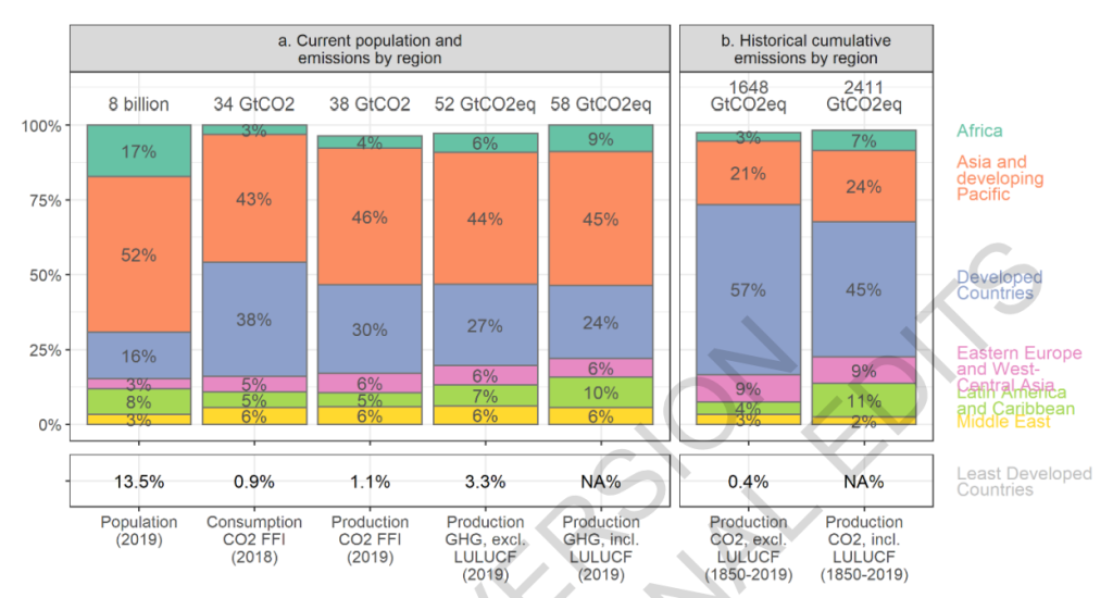 図 2.9d の「一人当たり排出量」ですが、国によってずいぶんと開きがあります。SPM の B3.1 には「世界の一人当たり人為的 GHG の正味排出量の平均値は 7.7 ~ 7.8 tCO2-eq に増加しているが、地域によって 2.6 ~ 19 tCO2-eq まで幅がある。」とあります。なんと 7 倍の開きがあるのです。「一人当たり排出量」は、経済発展の度合いを表す「一人当たり GDP」と排出削減の度合いを表す「GDP 当たり排出量」の積ですから、両者の影響を受けますが、途上国の値が小さいのは経済発展が進んでおらず、生活レベルが低いことによります。SPM の B.3.3 には「2019 年には、世界の人口の…(中略)… 41 % は (一人当たり排出量が) 3 tCO2-eq 未満の国に住んでいる。これらの低排出国の人口のかなりの割合が、近代的なエネルギーサービスへのアクセスを欠いている。」とあります。そして、これらの低排出国すなわち経済発展が遅れた国々こそ、気候変動の影響に対してはるかに脆弱な国々なのです。先進国が GHG を排出して地球温暖化を引き起こし、そのせいで気候変動に脆弱な途上国が被害を受ける。これはまさに「正義」に反した状況といえるでしょう。