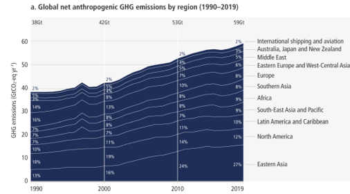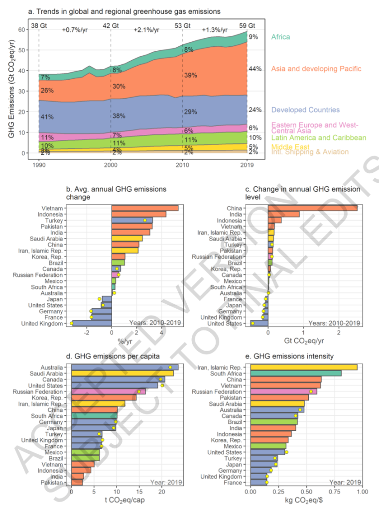 まず地域別排出量の推移を示す図 2.9 の a ですが、「先進国」が青色の部分です。この値は年を追うにつれて減少しています。一方、オレンジ色の「アジアと発展途上太平洋地域」の排出量が「先進国」の排出量の減少ペースを上回る勢いで増加し、世界全体の総排出量を押し上げていることが分かります。「先進国」の排出量が世界全体の総排出量中に占める割合は 1990 年は 41 % でしたが、2019 年には 24 % まで低下し、逆に「アジアと発展途上太平洋地域」の 2019 年のシェアは 44 % まで増加しました。