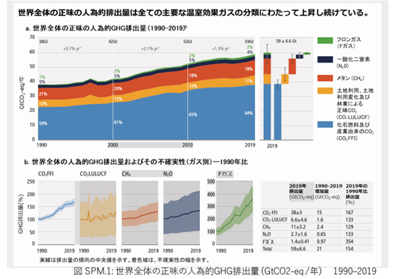図 SPM-1 をみてみましょう。IPCC の報告書の図は多くの情報を盛り込もうと、いくつかのパートに分けられているため複雑です。図 SPM-1 もこの例で、a、b 2 つのパートからなります。a は 1990 年から 2019 年までの世界全体の「正味の」人為的 GHG 排出量を表したもので、ガス種別の構成割合が色分けして示されています。青色とオレンジが CO2 で、それぞれ化石燃料の燃焼と工業プロセスからの CO2(CO2-FFI、青色)と、土地利用、土地利用変化および林業からの正味の CO2(CO2-LULUCF、オレンジ)になります。さらに残りがメタン(赤)、一酸化二窒素(黒)、フロンガス(緑)に分けられています。図の右には 2019 年に絞って、不確実性の大きさが棒線で示されています。また、bはガス種別に排出量の推移を表したものになっています。ここで排出量の前に「正味の(net)」という形容詞がついていることに注意してください。これは排出される GHG 量から、植物などの吸収源の作用によって大気中から吸収される GHG 量を差し引いた値であることを示すものです。吸収源については「連載講座 海ーエネルギー・環境」の「第3章エネルギーの基礎 コラム3.2 2050年カーボンニュートラルに向けてなすべきこと」に書きましたので、そちらをご覧下さい。