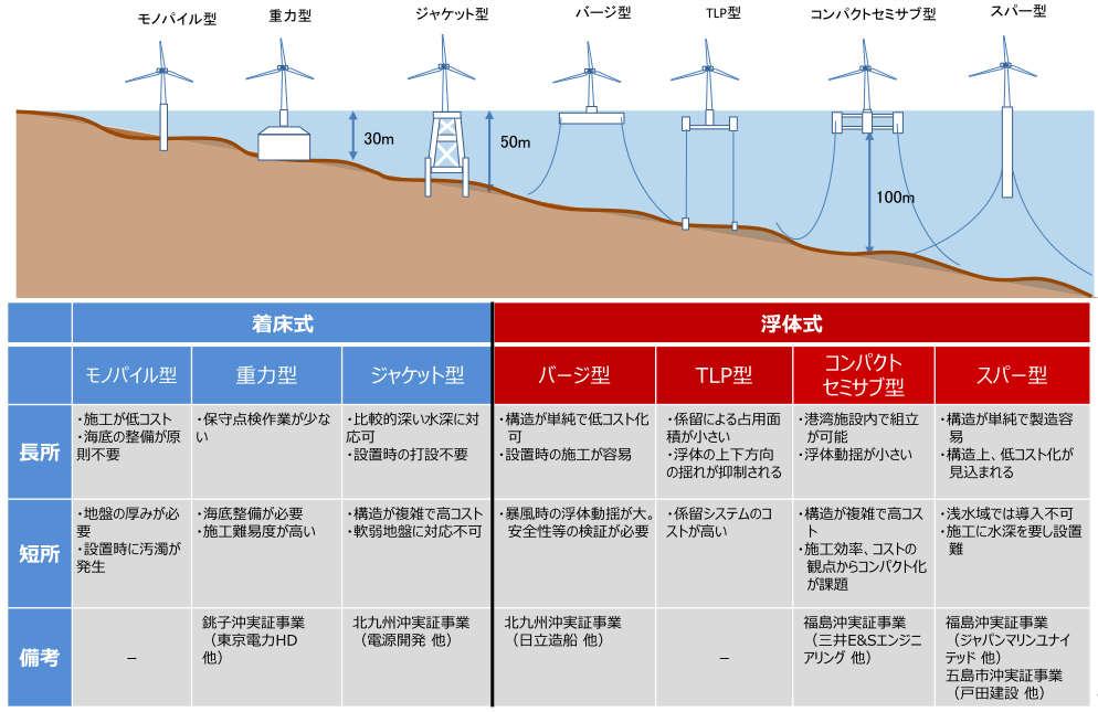 - 浮体 vs 着床:浮体の方が基礎・支持構造、組立・設置費用が高い